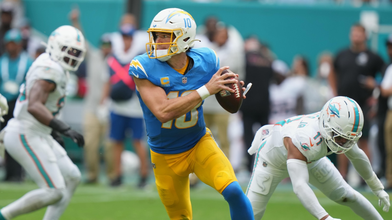 Justin Herbert's play to set up the game-winning field goal in the Los Angeles Chargers' 29-27 victory over the Miami Dolphins allowed head coach Jim Harbaugh to heap more praise on his star quarterback